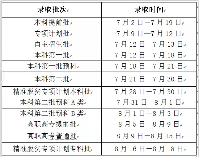 2016年我区高校招生录取工作共分为12个批次进行,录取工作于7月2日开始,预计8月18日全部结束。具体录取时间的安排如下: