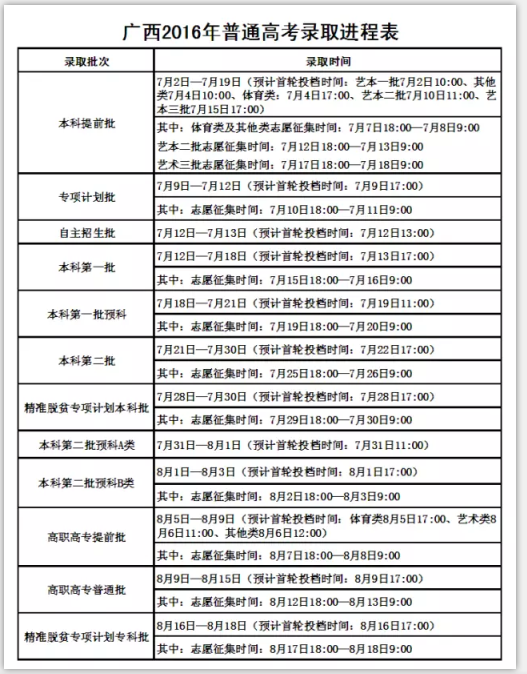 广西2016年普通高考录取进程表